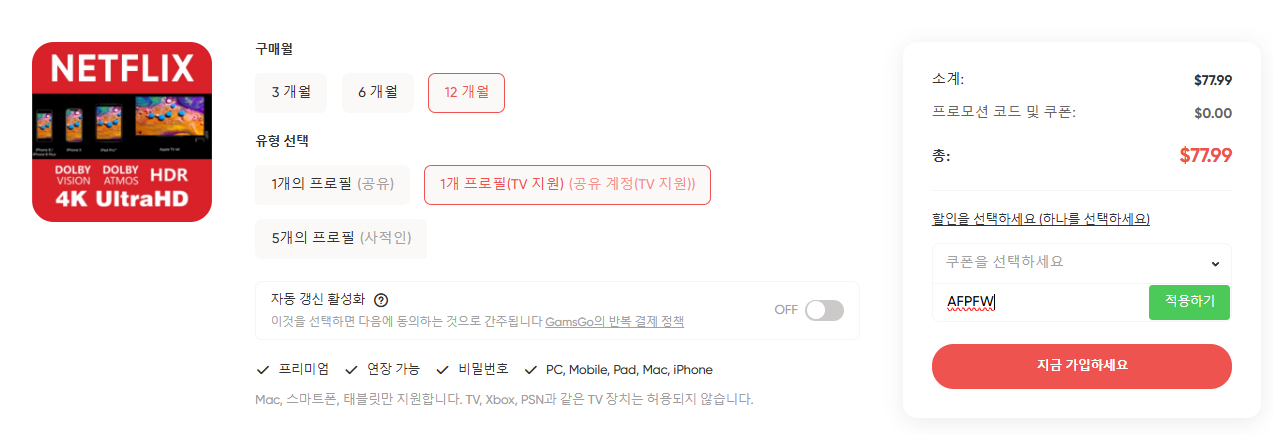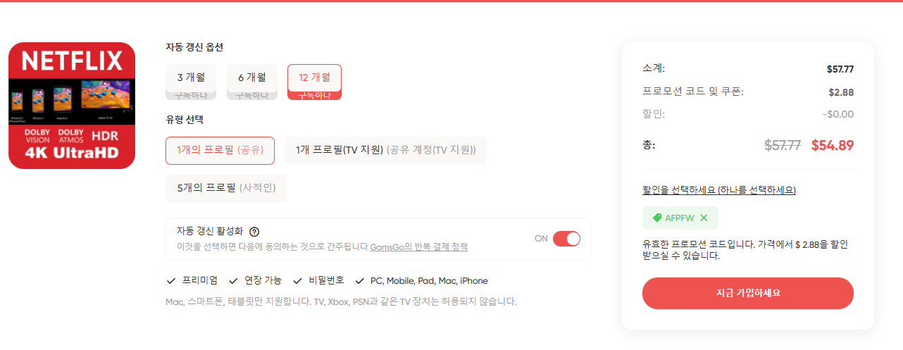 넷플릭스 요금제 OTT 구독 공유 사이트 겜스고 5% 할인 코드 AFPFW