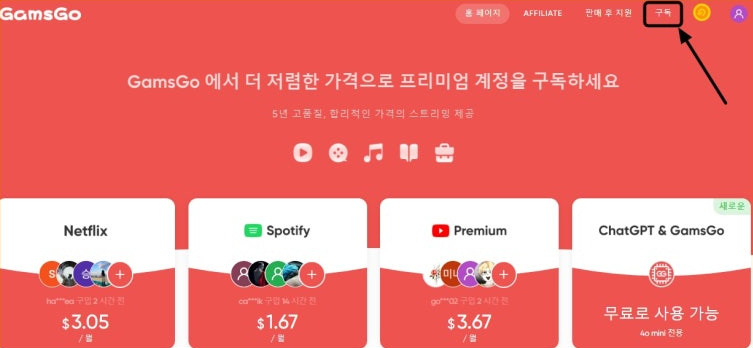 겜스고는 공유 OTT 플랫폼으로 구독 서비스를 공유할 수 있으며 현재는 월 5.26달러에 이용이 가능합니다. 겜스고 웹사이트에 접속하여 회원가입 후 넷플릭스를 선택하여 할인 구독을 하시면 됩니다.