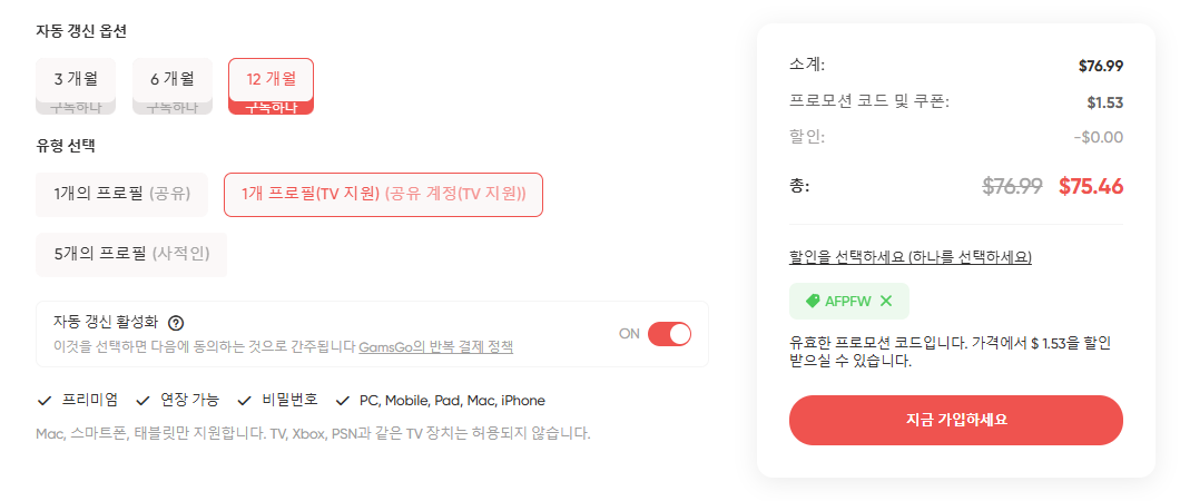 프로모션 코드 적용하게 되면 1.55달러를 추가로 할인을 받을 수 있으며 12개월의 요금은 76.44달러로 월 9천원대에 시청을 하실 수 있게 됩니다. 프리미엄 서비스가 제공이 되며 PC, 모바일, 테블릿, 맥, 아이폰 등에서 사용이 가능하게 됩니다.