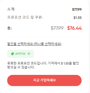프로모션코드 AFPFW 입력하시면 추가로 할인을 받으실 수 있고 아래 링크를 통해서 회원가입을 하시고 구독하시면 됩니다.