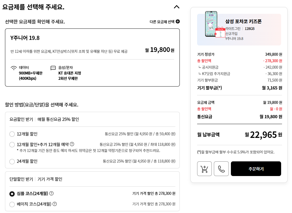 공시지원금과 추가지원금 할인을 받으면 기기 할부원금은 71,500원으로 매달 3,165원 정도씩만 납부하면 사용을 할 수 있어서 총 비용은 22,965원에 키즈폰을 이용하실 수 있습니다.