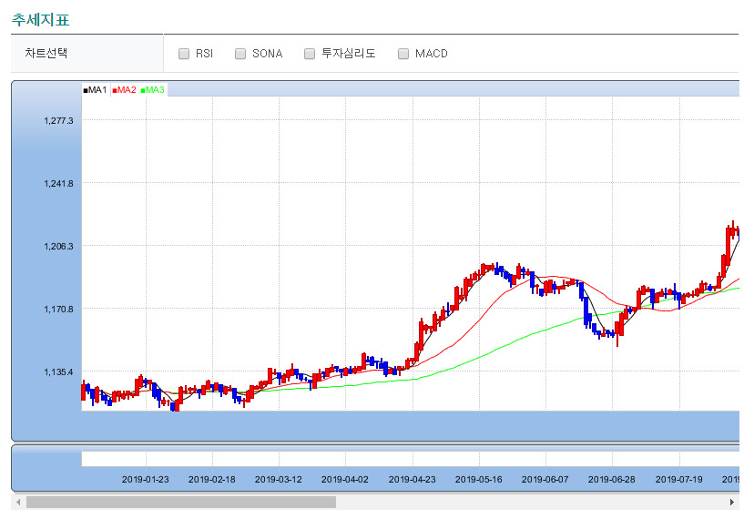 다음은 추세지표 인데요. 주식의 차트처럼 환율의 변동을 확인 할 수 있어요. 자신이 원하는 기간부터 이동평균선까지 다양하게 설정할 수 있는데요. 달러로 재테크를 하시는 분들에게도 유용하게 쓰이겠네요.