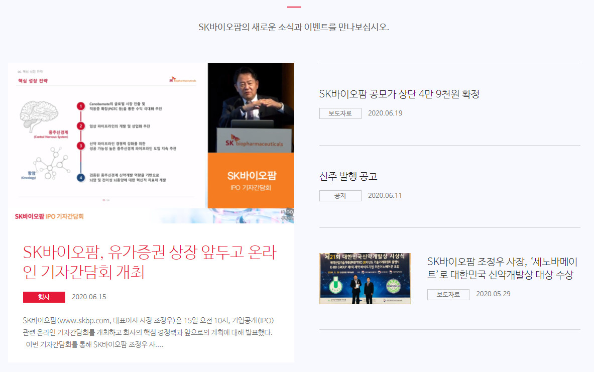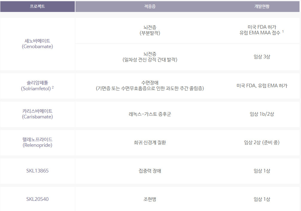 SK바이오팜은 주로 정신질환 신약을 개발하고 있고, 뇌전증, 수면장애 신약을 허가받고 판매중입니다. 희귀신경계 질환, 조현병, 조울증, 뇌전증 등 임상 진행중이기 때문에, 앞으로 임상 도입이나, 임상 허가 소식이 발표가 될때마다 주가는 요동칠 것 같네요.