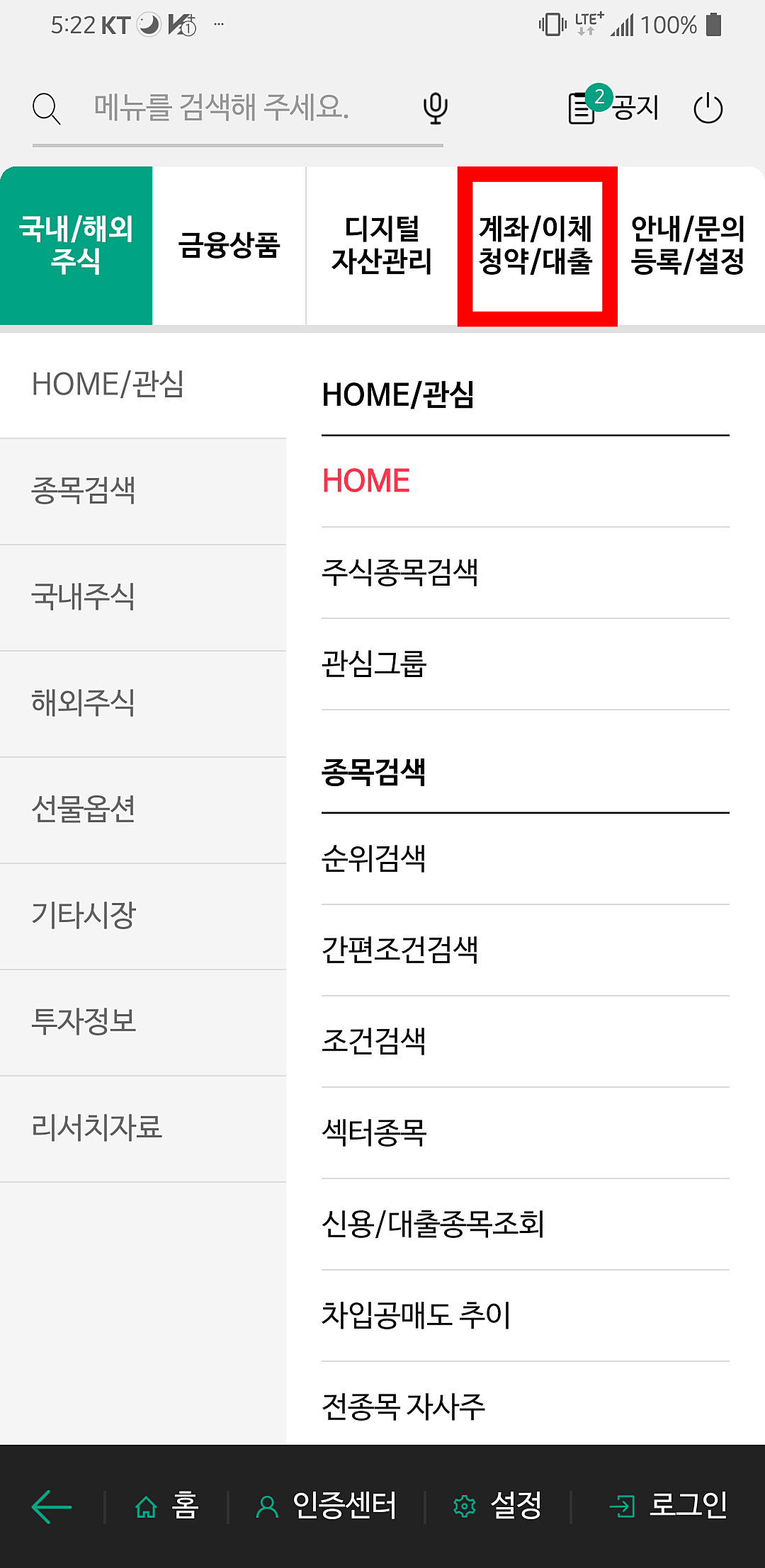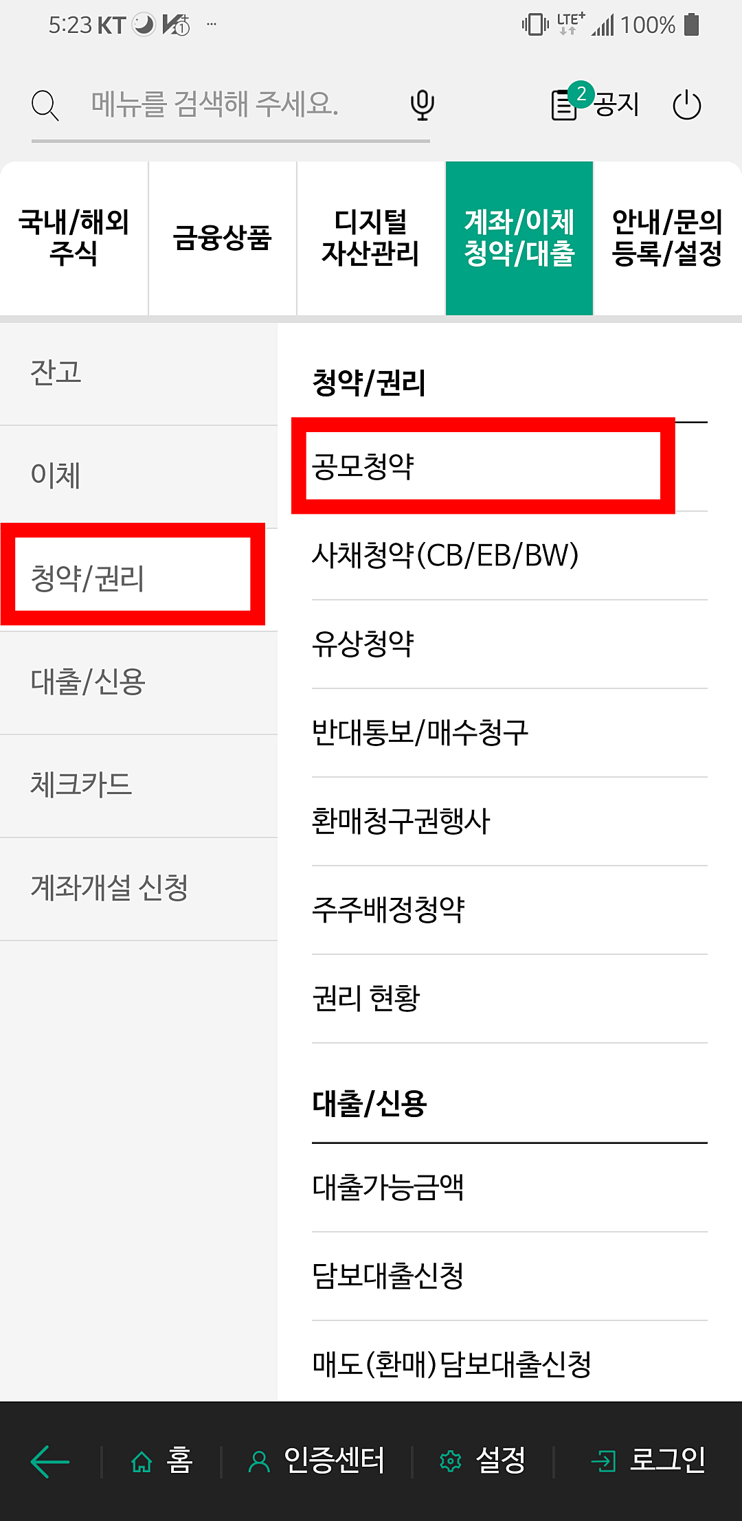 NH증권 나무 어플 다운 받으시면 다음과 같은 화면이 나오는데요. 계좌/이체 청약/대출 항목을 눌러보시면 청약/권리 가 보이실꺼에요.