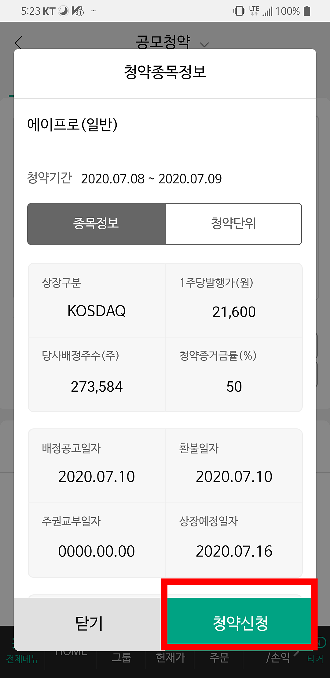 공모청약을 누르시면 해당일에 청약이 가능한 종목이 나오는데요. 오늘은 에이프로 하나 있어요. 에이프로 선택하시고 청약신청을 누르시면 되요.