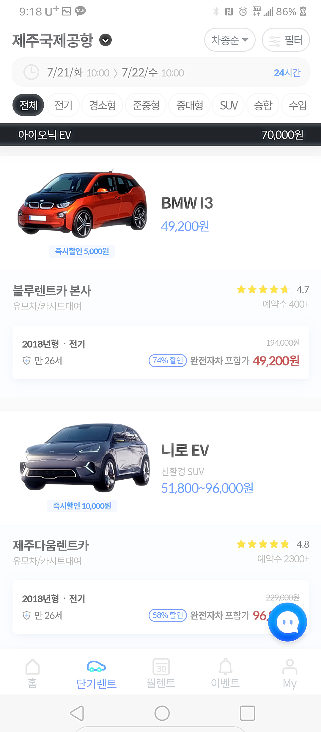 그래서 BMW I3, 니로EV, 코나EV, 아이오닉EV가 대표적인 렌트카인데요. 제주도에서는 흔하게 보이는 차종이죠. 대여하는 가격도 비싸지 않아요. 물론 성수기때랑 비수기때랑 가격차이는 어쩔수 없지만 완전자차 포함해서 BMW I3가 5만원정도이고, K5 3세대가 완전자차로 10만원대이면 전기차를 타는게 낫지 않을까 싶네요. 참고로 BMW I3는 좀 차량이 작은편이니, 코나EV나, 니로EV가 가성비가 가장 괜찮다고 생각되요.