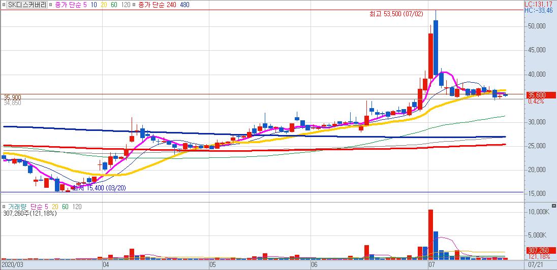 SK디스커버리는 데드크로스가 났지만, 이번 호재로 차트가 다시 골든 크로스로 당분간 상승 여력이 있을것 같습니다. 지난번 슈팅이 있을때 물렸던 사람들의 물량을 소화한다면 전고점을 돌파하여 상승하겠지만, 디스커버리는 직접적인 연관이 조금 부족해 보입니다.
