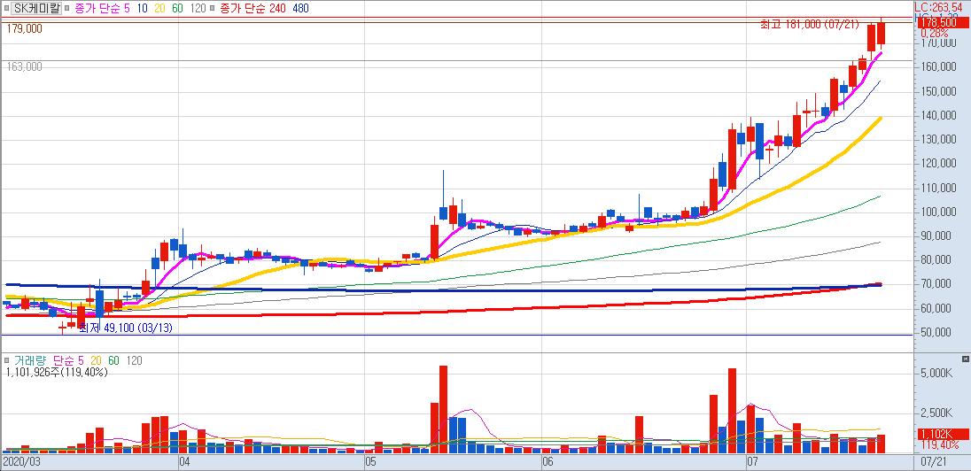 SK케미칼은 3월13일 최저가격인 49100원부터 거의 쉬지않고 상승한 느낌인데요. 연일 신고가를 행진하고 있는 가운데 이번 소식으로 인해 다음날 상한가까지 기대해볼만하지 않을까 싶네요.
