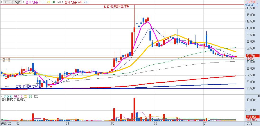 SK바이오랜드는 차트의 흐름이 좋아 보이지는 않는데요. SK바이오랜드, SK바이오팜은 뇌전증, 희귀 신경계 질환, 집중력 장애, 조현병, 조울증, 뇌전증, 화장품원료 등 의약품등을 만드는 업체로 신약을 연구 개발 하는 회사이기 때문에 이번 아스트로제네카의 생산과는 밀접한 관계는 떨어집니다.