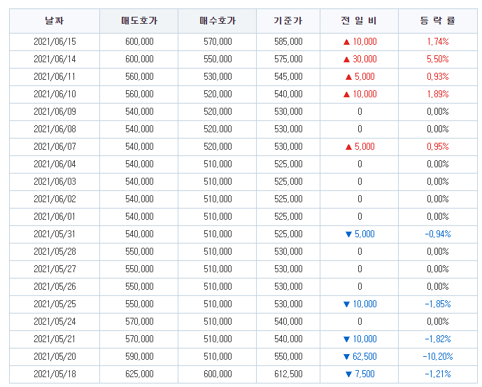 현재 거래되고 있는 크래프톤 주가 가격은 585000원 입니다. 5월에는 최고 300만원 가까이 갔다가 주가가 많이 내려왔네요. (장외주식 무섭네요)