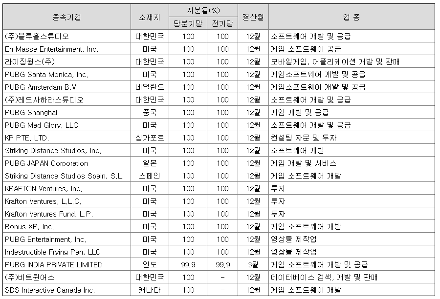크래프톤에 종속회사들로는 블루홀스튜디오, 라이징윙스, 펍지(PUBG)가 대표적입니다.