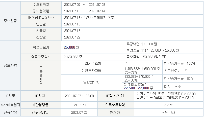 - 공모청약일 : 2021.07.13 ~ 2021.07.14