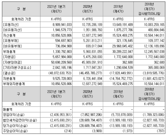 매출액은 하나도 발생하지 않으며 현재 계속해서 영업손실액만 있을뿐입니다.