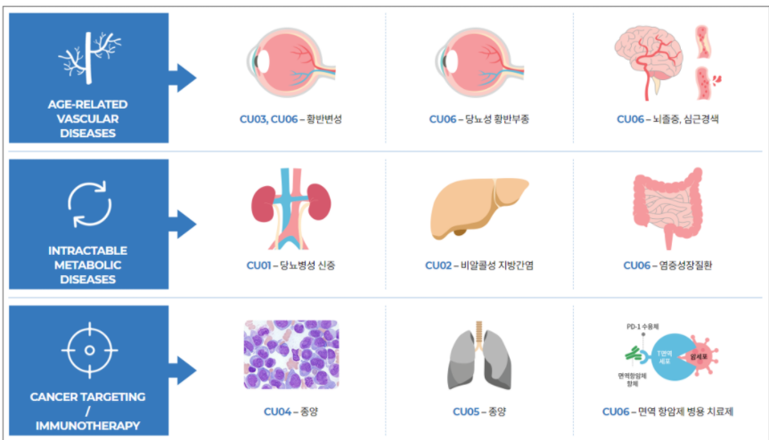 큐라클은 난치성 혈관 및 대사성질환의 혁신적인 치료제 개발을 목표로 하고 있습니다. 3개의 임상 파이프라인과 후속 5개의 파이프라인을 구축하고 있습니다.