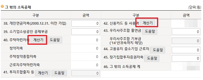 주택마련저축, 신용카드 사용액도 모두 계산기 버튼을 눌러서 불러와야 한다. 그외에도 불러와야 할 항목들이 더 있다.