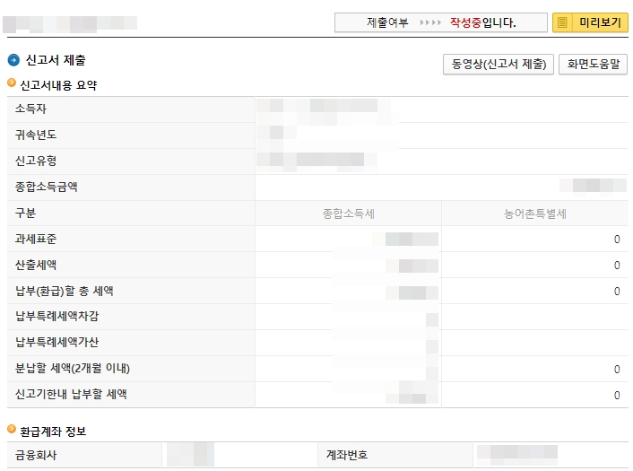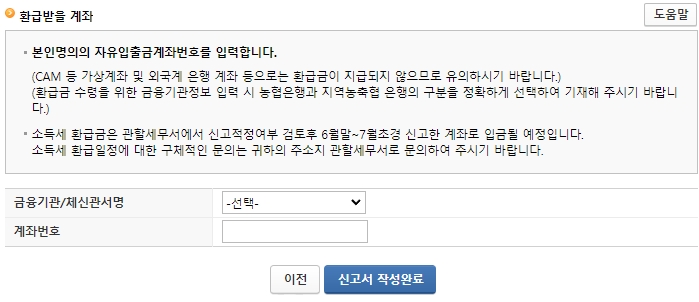 마이너스로 표시가 되어 있다면 환급 받을 계좌를 입력해야 한다. 은행명, 계좌번호를 입력하면 되고 본인명의의 통장으로 해야 한다.
