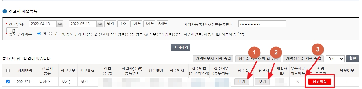 종합소득세 신고를 하고 난뒤 지방세를 신고해야 하는데 신고내역을 통해서 할 수 있다. 화면에 보이는것처럼 접수증, 납부서 보기 버튼을 먼저 누르고 지방소득세 신고를 해야 한다.