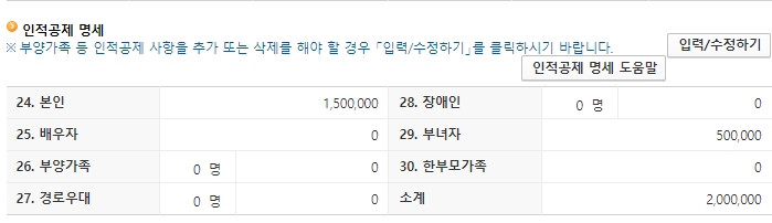 가장 먼저 입력해야 하는것은 인적공제다. 인적공제는 본인의 경우 150만원이 되고 배우자나 부양가족이 있을경우 인적공제가 늘어나게 된다.
