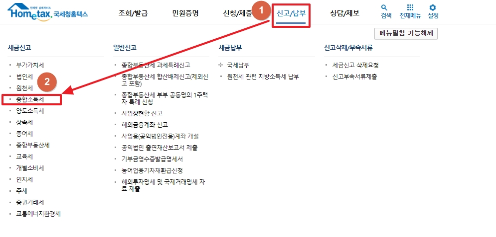 국세청 홈텍스에 접속하여 신고/납부-종합소득세를 눌러준다.