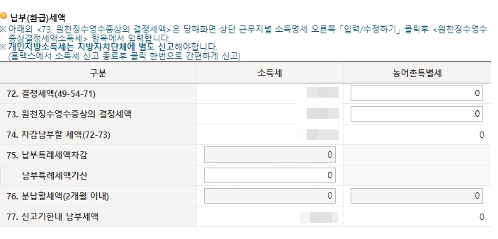 모든걸 입력하고 나면 결정세액이 나오게 된다.(72번) 그리고 77번 항목의 신고기한내 납부세액이 납부하거나 또는 환급 받는 금액이다.