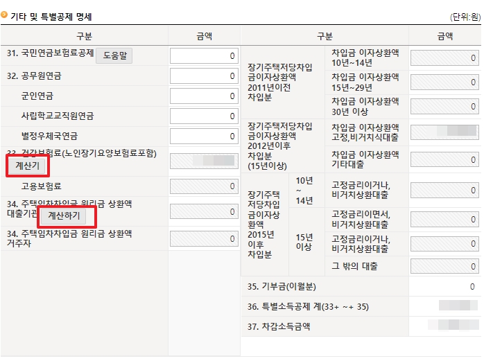 대부분 정보들을 불러와서 알아서 입력되어 있지만 하나씩 해줘야 하는것들이 있다. 아래쪽에 신고하는것들을 보다보면 건강보험료, 주택임차차입금 원리금 상환액 대출기관 과 같이 계산기 또는 계산하기 버튼이 있는것들은 꼭 전부 눌러줘야 한다.