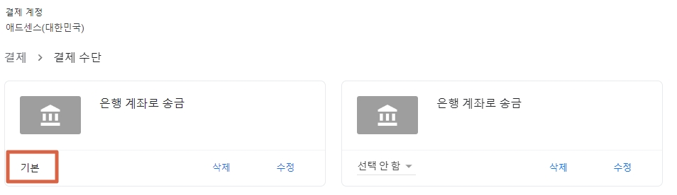 구글 애드센스에서 지급 결제정보를 누르시면 결제수단 관리를 하실 수 있습니다. 기존에 지급받고 있는 방법이 있었다면 수정을 하셔도 되고, 신규로 추가로 하셔도 됩니다. 그 후 기본으로 선택할 것만 정하시면 됩니다.
