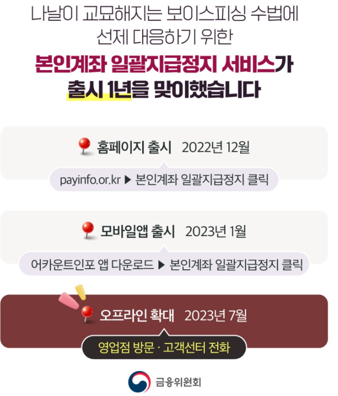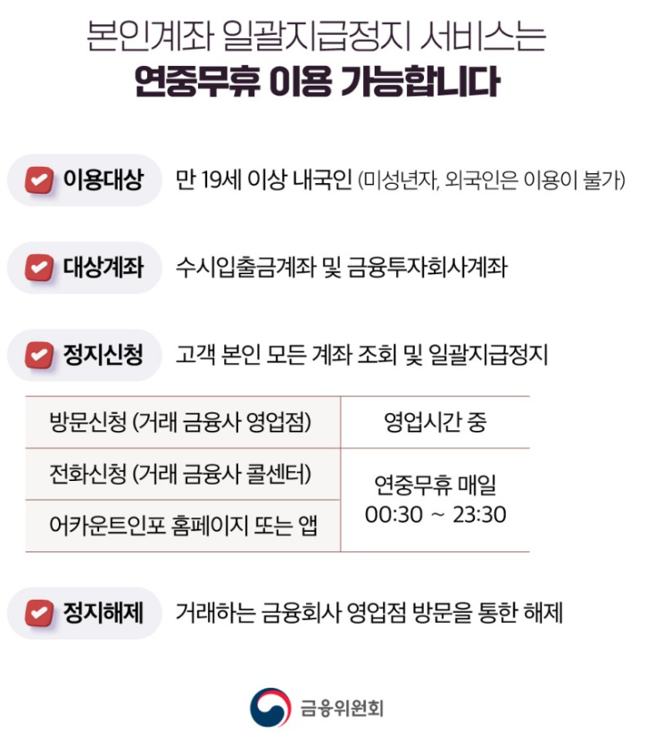 오늘은 보이스피싱 피해 받게 되거나 의심이 될 때 계좌정지를 하기 위한 본인계좌 일괄지급정지 서비스에 대해서 알아보았습니다.