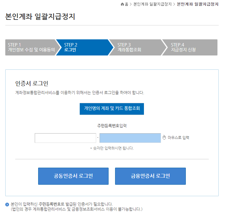 또한 인증서 로그인을 통해서 개인명의 계좌 및 카드 통합조회를 하기 위해서는 주민등록번호 및 공동인증서나 금융인증서 로그인이 필요합니다.