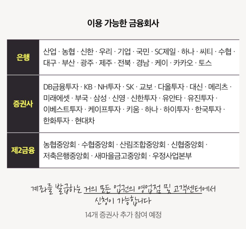 이 외에도 14개의 증권사 추가 참여할 예정이니 앞으로는 계좌를 발급하는 모든 증권사나 은행 및 제2금융권에서도 신청이 가능하게 됩니다.