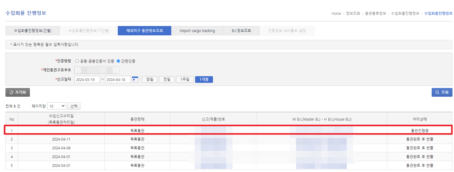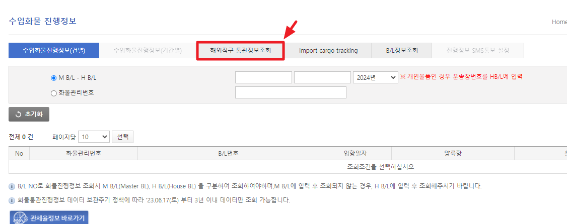 먼저 국가관세종합정보망 서비스인 유니패스에서 조회가 가능하니 유니패스에 정보를 조회하셔야 합니다.
