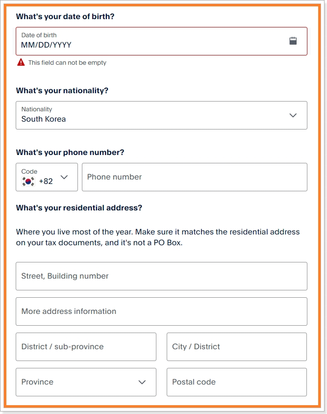 5. 개인정보를 입력하기 위해 월/일/년 순서로 입력후 전화번호와 영문 주소를 작성하시면 됩니다.