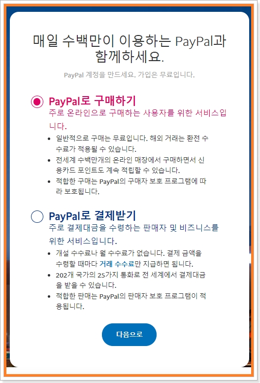 2. 페이팔 가입할 때 구매 또는 결제받기 등을 선택합니다. 어떤것을 선택해도 상관없습니다. 다만 송금을 받으려고 한다면 페이팔 결제받기를 누르고 계정을 생성하셔야 합니다.