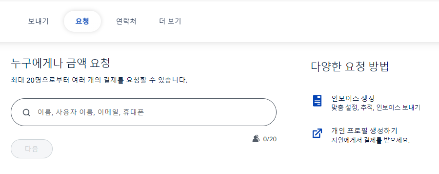 결제 대금을 요청하기 위해서는 사용자의 이름, 이메일 휴대폰을 통해서 요청을 할수도 있으며 인보이스를 생성하여 보낼수도 있습니다.