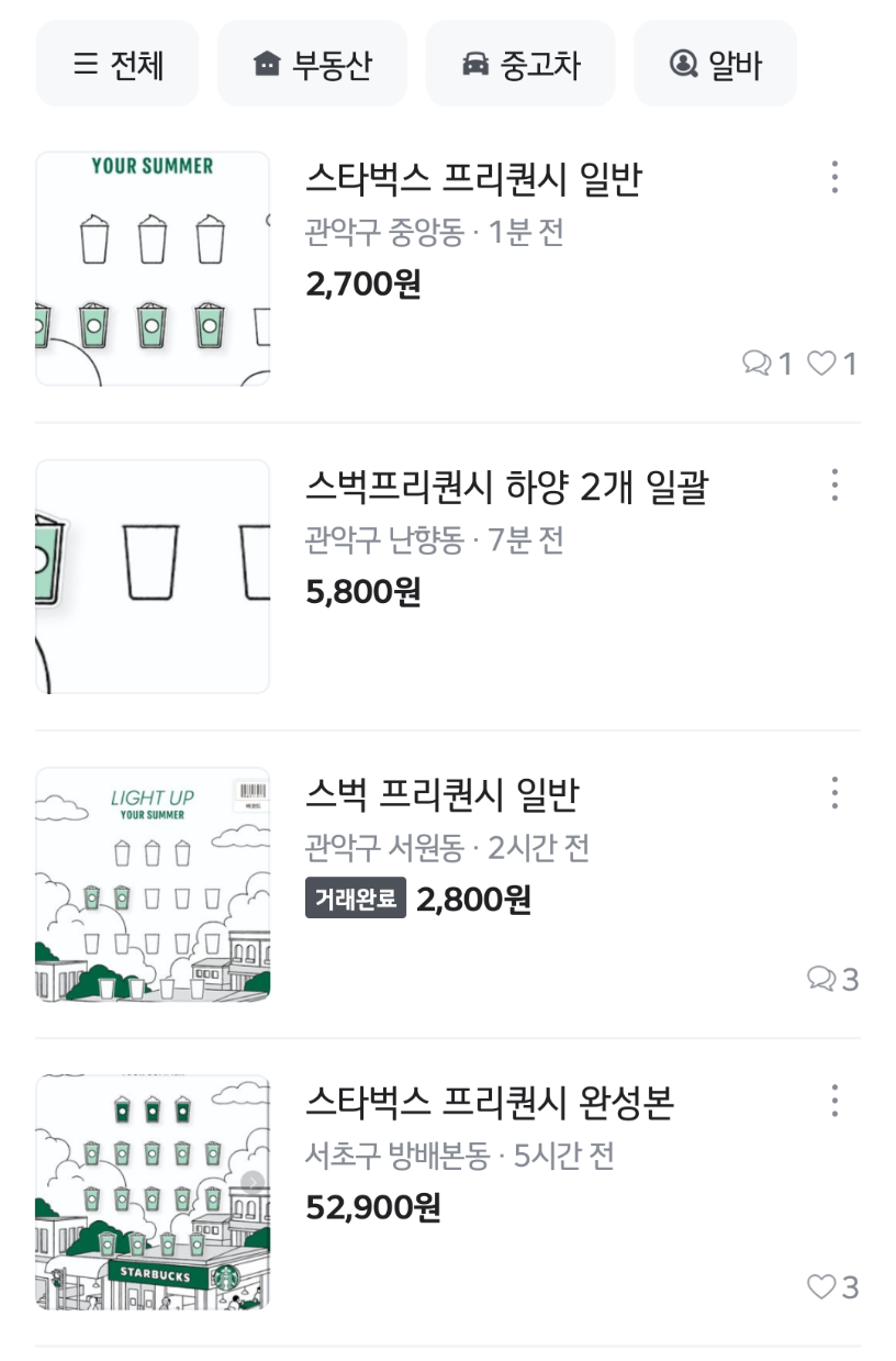 스타벅스 프리퀀시 거래 방법 사고 팔기 선물 중고마켓 당근 나눔