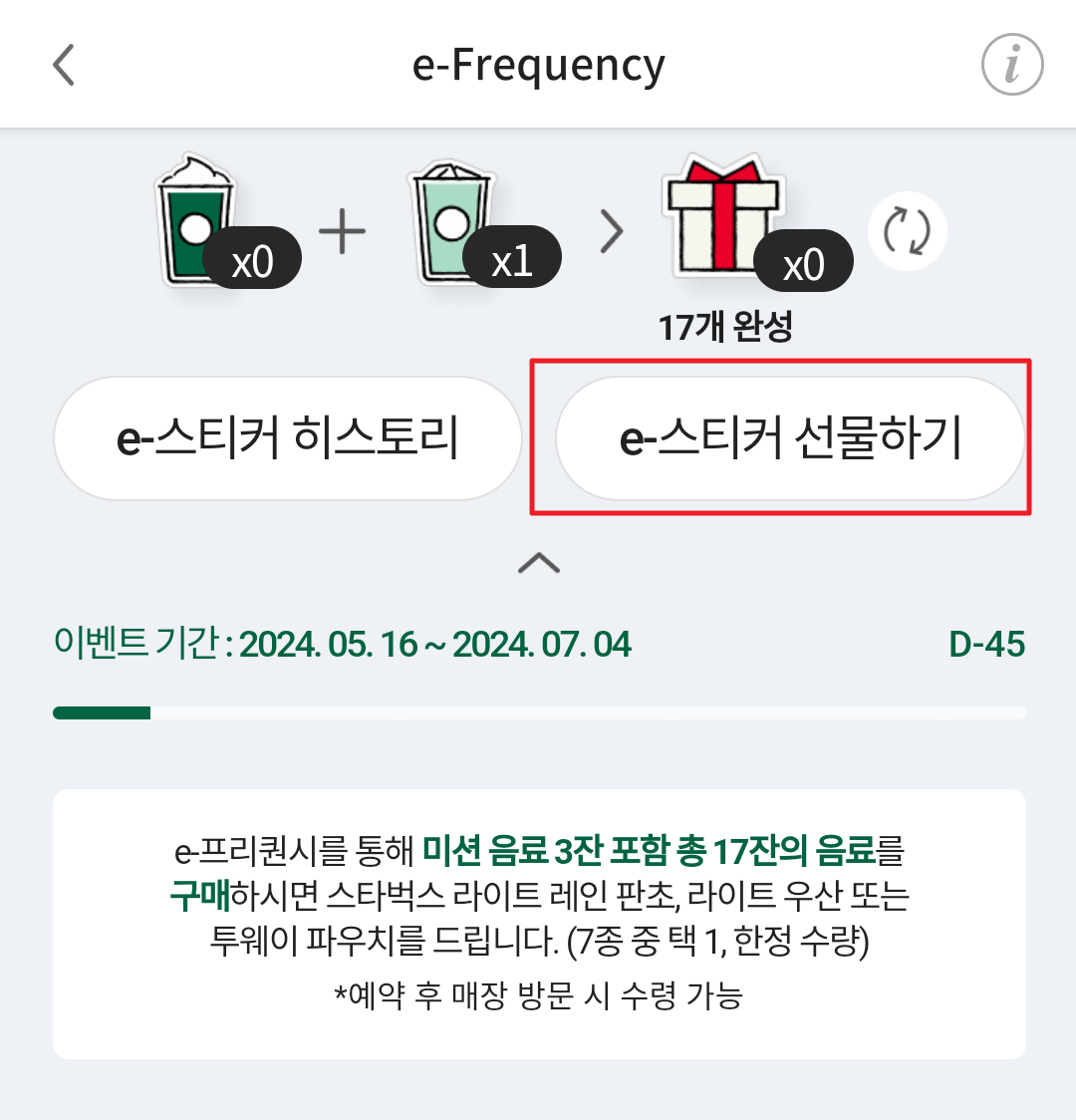 스타벅스 앱 내에서 프리퀀시를 누르면 현재 모은 프리퀀시를 확인할 수 있으며 e스티커 선물하기 버튼을 통해서 다른 사람에게 보낼 수 있습니다.