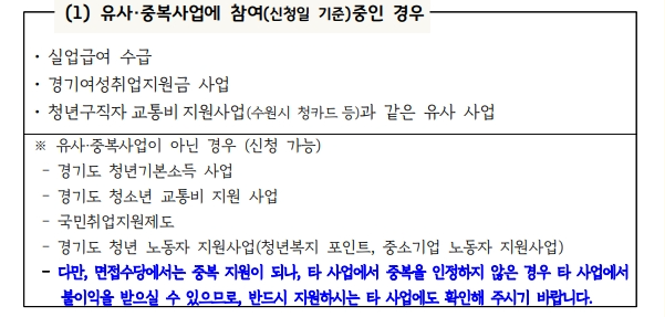주의하실점은 실업급여를 수급받고 있거나 경기 여성 취업지원금 사업에 참여하고 있거나 청년구직자 교통비 지원사업과 같은 유사 사업에 참여하고 있다면 신청하실 수 없습니다.