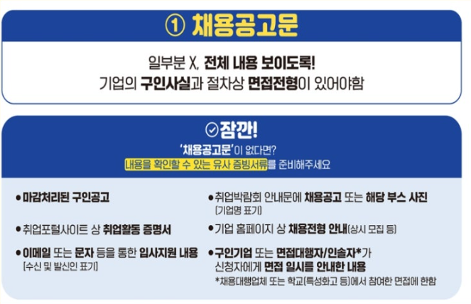 채용공고문 전체가 보이도록 하고 만약 채용공고문이 없다면 내용을 확인할 수 있는 유사 증빙서류를 준비하시면 됩니다. 취업활동증명서, 이메일 또는 문자 등을 통한 입사지원 내용, 기업 홈페이지상 채용전형 안내등
