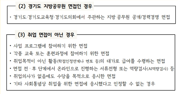 경기도에 거주하고 있으면 되고, 회사는 경기도 외 지역이여도 상관이 없습니다. 재직 여부 그리고 합격 여부와 무관하게 신청할 수 있으며 단시간 일자리에 응시한 면접도 신청 대상입니다.