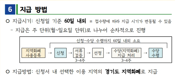 - 지급방법 : 신청 후 60일 내외로 선택한 이용 지역의 경기도 지역화폐로 발급